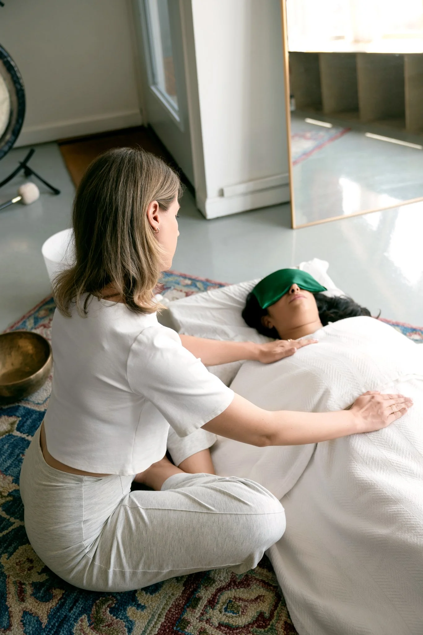 You’re guided through the practice — whether coaching, Reiki, breath, or sound.